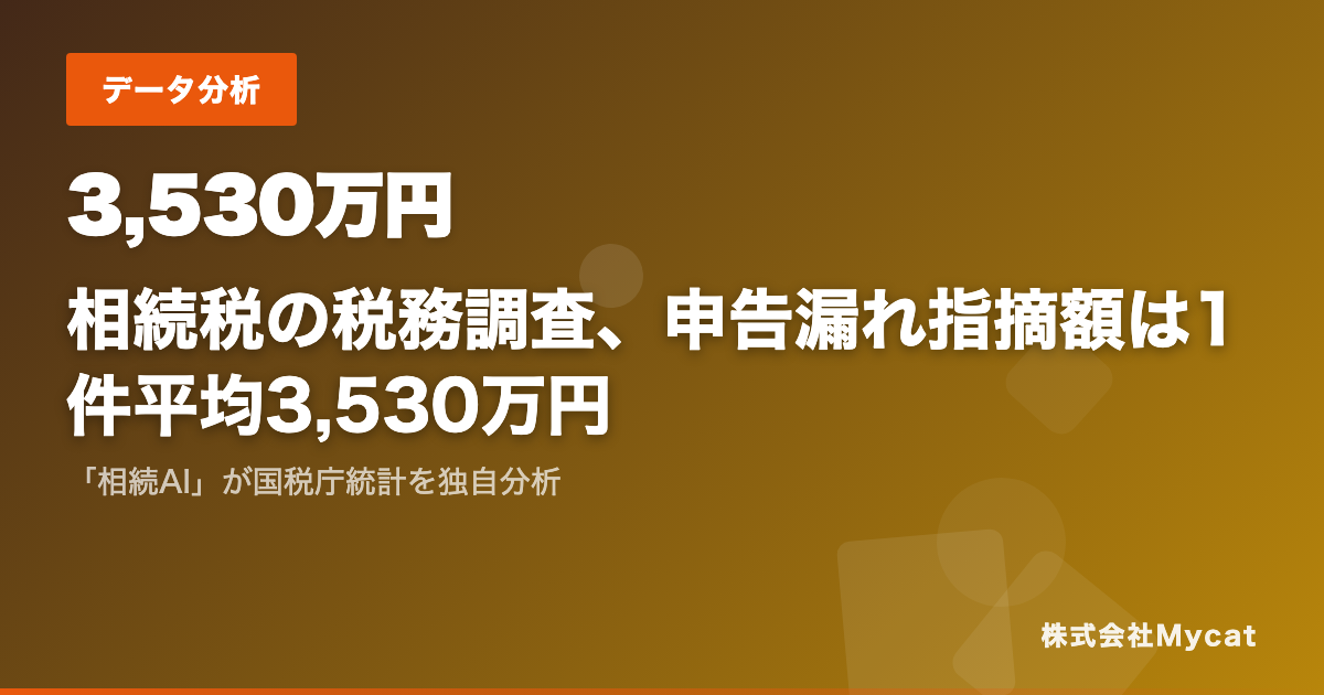 国税庁が公表している相続税の調査事績によると、税務調査で申告漏れを指摘された場合の1件あたりの指摘額は平均3,530万円に上ります(出典:国税庁 相続税の調査等の状況)。この金額には、申告漏れとなっていた財産の評価額と、それに伴う追徴税額が含まれます。