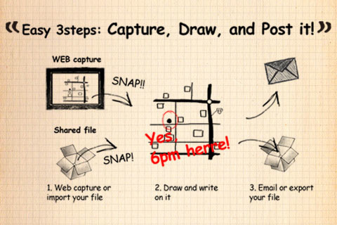 忙しいあなたの「閃き」を、サッと描いてスグに送れるツールです。しかも、WEBスクリーンショット(キャプチャ)機能付き。WEB以外では、写真、地図、スケッチ、白紙…いろんな画像ファイルの上に、描いて送れる!外出中や移動中の、直感とスピードを大事にできます。
