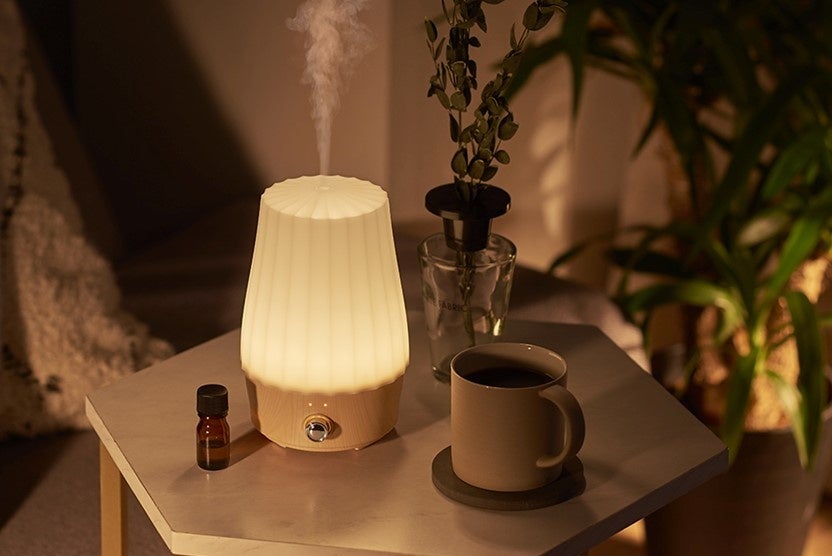 カラーはインテリアにも合わせやすい木目調の「ブラウン」と「ナチュラル」の2色展開。アロマの香りと柔らかい灯りで穏やかなリラックスタイムを演出します。
