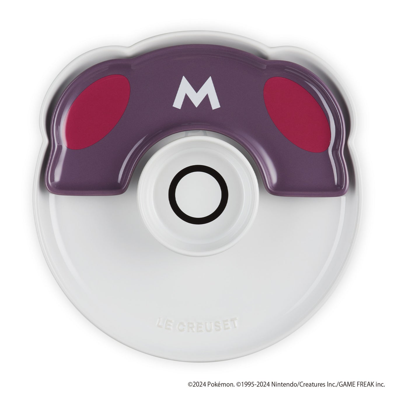 マスターボールの上部をイメージした紫のプレートと、ボタンをイメージさせる中央の小さな円形ディッシュ、白い直径25cmのプレートのセット。白いプレートにメインのお料理、紫のプレートに副菜、センターにソースや付け合わせを盛りつければワンプレートの完成。紫のプレートを取り外すと、白いプレートにはあの伝説のポケモンのシルエットが……。