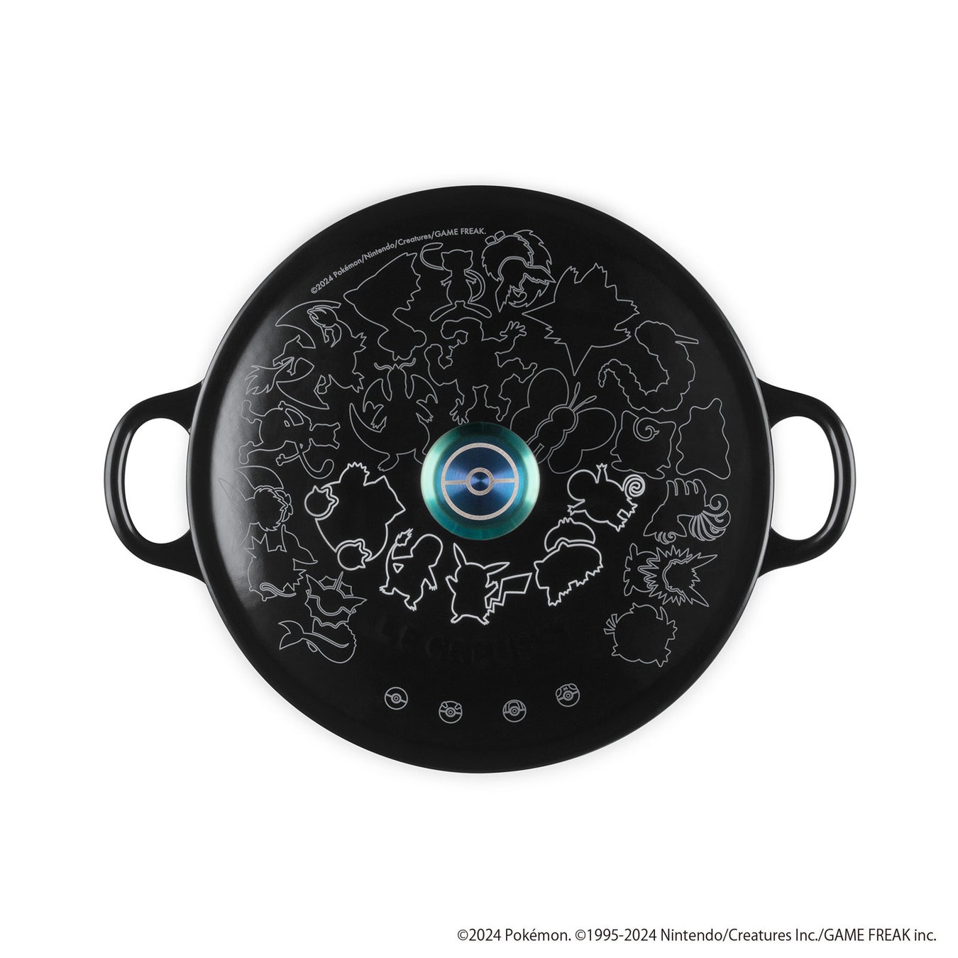 「シャイニーブラック」のお鍋はグラデーションのないソリッドカラー。フタには23匹のポケモンと4種類のボールがラインアートで描かれ、ツマミは虹色に輝くイリディセントツマミを採用しています。