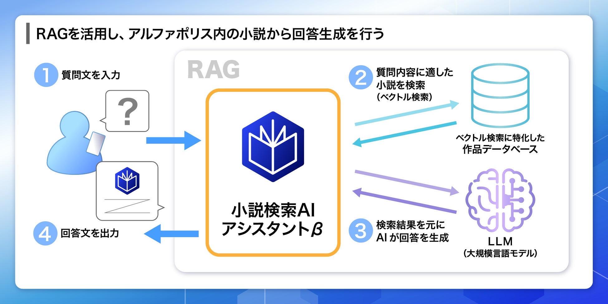 本機能はRAG(検索拡張生成)を活用することで、読者からの質問に対して膨大な小説データの中から最適な作品をベクトル検索により抽出、その検索結果に基づいて大規模言語モデル(LLM)が回答する、という仕組みを採用しています。サービス内に実在する小説作品に基づいて回答が生成されるため、ハルシネーションの発生を軽減し、回答の精度を高めることが可能となります。