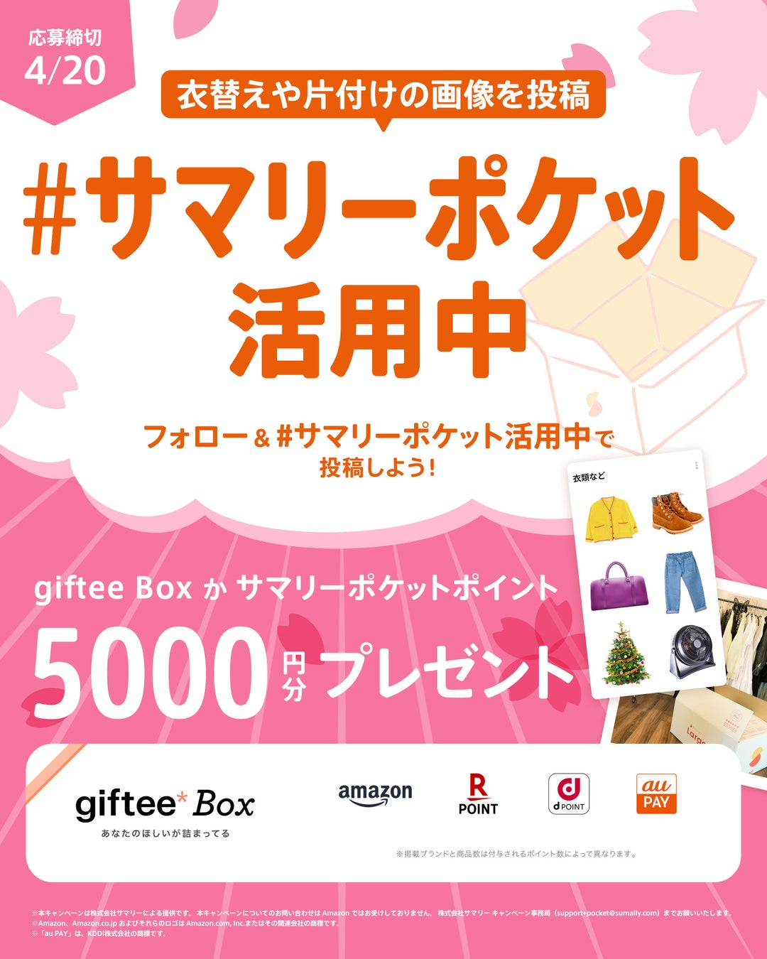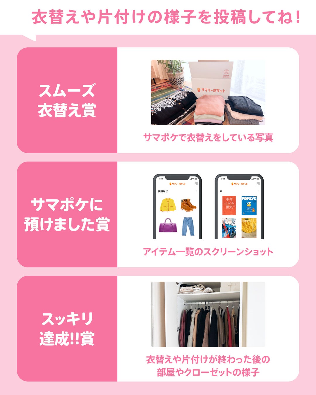 株式会社サマリー(本社:東京都千代田区、代表取締役:日下部康介)が運営する、荷物保管サービス「サマリーポケット」は、春の衣替えシーズンに向けて、新規ご利用者様向け最大4ヶ月保管料無料「春の衣替えキャンペーン」を実施!すでにサマリーポケットをご利用の方にもおトクな特典をご用意しました。さらに、衣替えの様子をSNSに投稿すると5,000円分のギフト券が当たるSNSキャンペーンも同時開催中です。