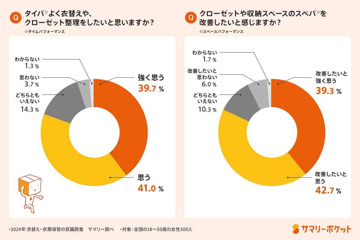 「タイパ(タイムパフォーマンス)よく衣替えやクローゼット整理をしたいと思いますか?」と尋ねたところ、約8割の人が「タイパよく衣替えしたい」と回答しました。また、「クローゼットや収納スペースのスペパ(スペースパフォーマンス:空間対効果、空間を効率よく活用する暮らし方)を改善したいと感じますか?」という質問に対しても、約82%の人が「スペパを改善したい」と答えています。