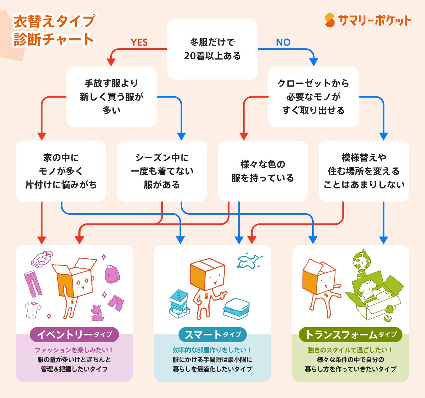 以下、3つのタイプごとの特徴と、それぞれに最適な衣替え方法を詳しくご紹介します。