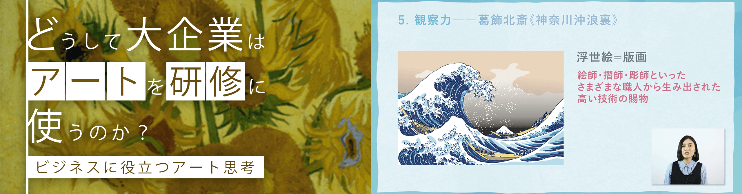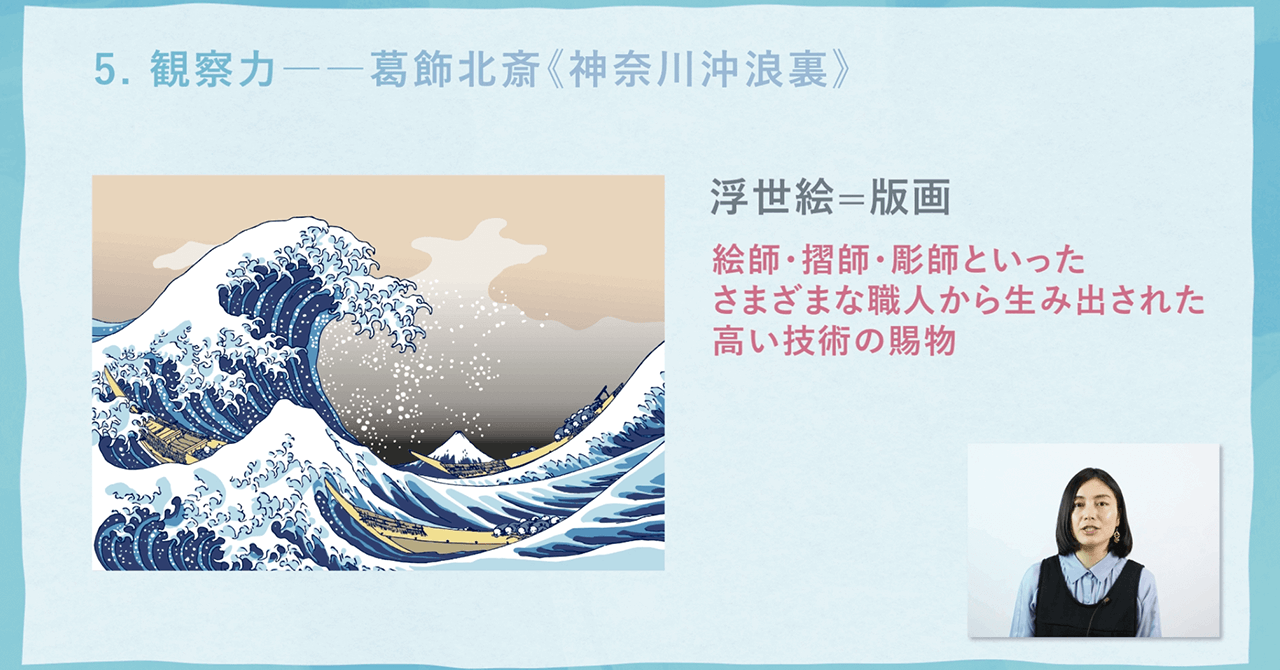 本動画講座では、ゴッホや葛飾北斎などの名画を鑑賞し、講師の問いかけを通じて思考を深めていきます。鑑賞する中で「なぜ?」と疑問に思うことや、絵から得られる情報をメモし、後半の解説パートで、鑑賞する際に注目するポイントや、物事の捉え方や思考の癖に気がつくことができるでしょう。