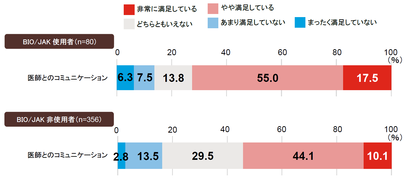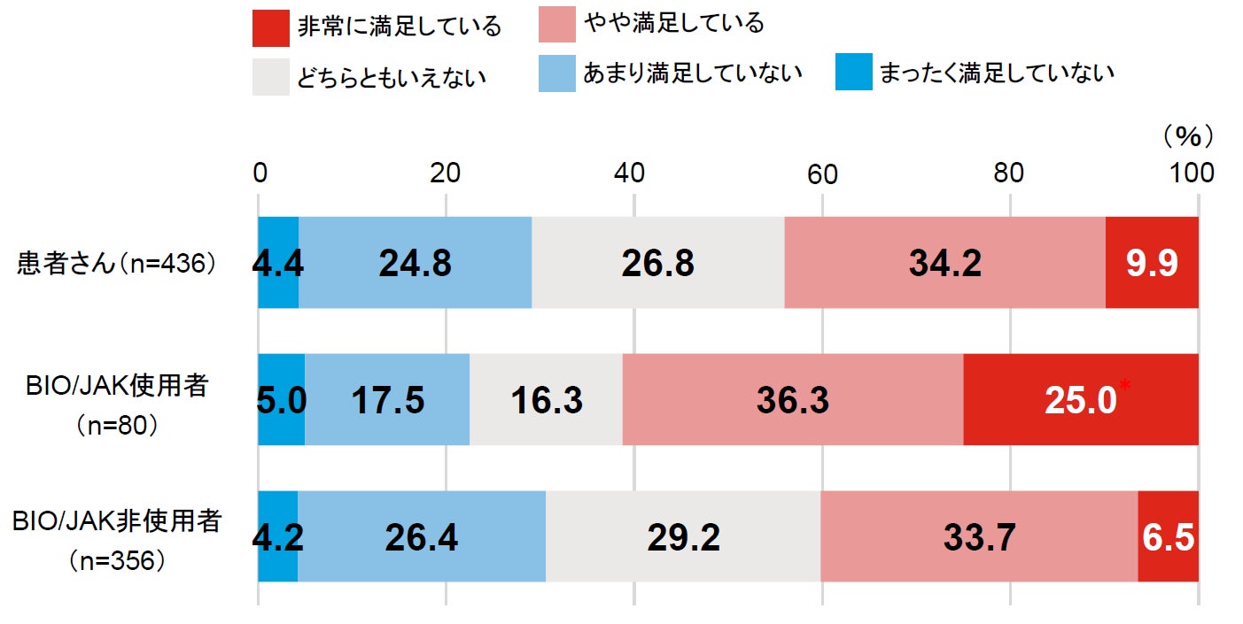 さらに、本調査では、アトピー性皮膚炎患者さんの中でも、生物学的製剤またはJAK阻害剤を使用している患者さんは、非使用者の6.5%に比べて治療に非常に満足している割合が25%と高いことが示されました。