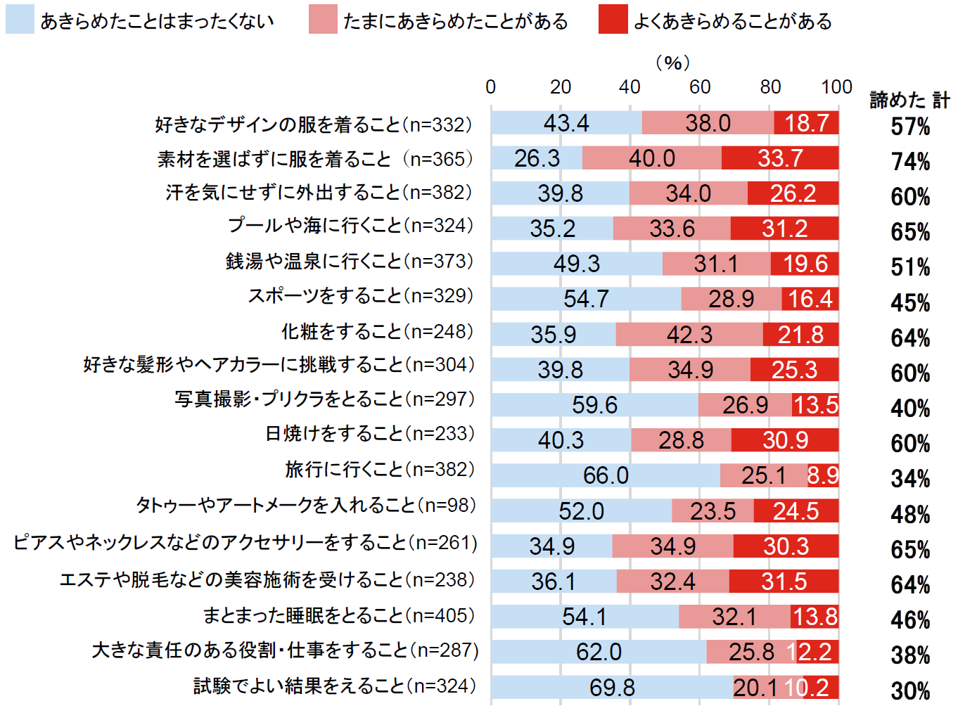Q:あなたは、アトピー性皮膚炎により以下のことをあきらめたことがありますか?どの程度ご自身にあてはまるかお知らせください(患者さんが回答 *「興味がない」を除く)。