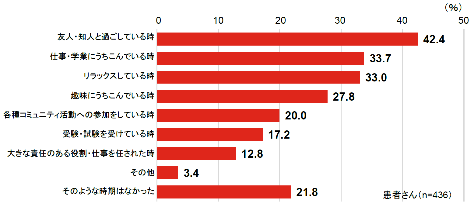 今回の調査結果から、アトピー性皮膚炎患者さんは日常生活において、一般生活者より毎日の皮膚ケアに費やす時間的負担があるだけでなく、55%の患者さんが睡眠への影響があると回答しました。また、外用剤に関する項目に加え、「人目が気になる」、「日用品の素材に気をつかう」、「かゆくて眠れない日が多い」、「おしゃれができない・制約されている」といった困りごとが一般生活者の方より有意に高い割合で示されました。さらに、アトピー性皮膚炎でなかったら良かったと患者さんが強く思う時期は「友人・知人と過ごしている時」が最も高く42%の患者さんが回答したことが分かりました。