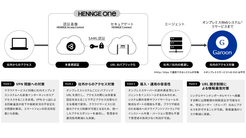 「HENNGE Connect」と「Garoon」が連携することにより、「HENNGE One」を利用する企業は「HENNGE One」にログインするだけで、社内LANに構築された「Garoon」へもVPN接続をすることなくアクセスすることが可能となり、セキュリティリスクを低減しながら安心して「Garoon」を利用できます。