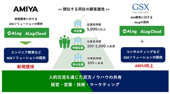 GSX、網屋の両社は従業員規模100名から5,000名の企業を主力ターゲットとしている共通点がある一方、取り扱い商材が異なる点から、両社顧客へのクロスセル・アップセルが有効に働きます。このシナジーを強固にするため、GSXは、網屋株式を取得し、人的交流を通じ、経営・営業・技術・マーケティングのノウハウ、及び顧客基盤の共有を行うことでシナジー実現を強力に推進します。