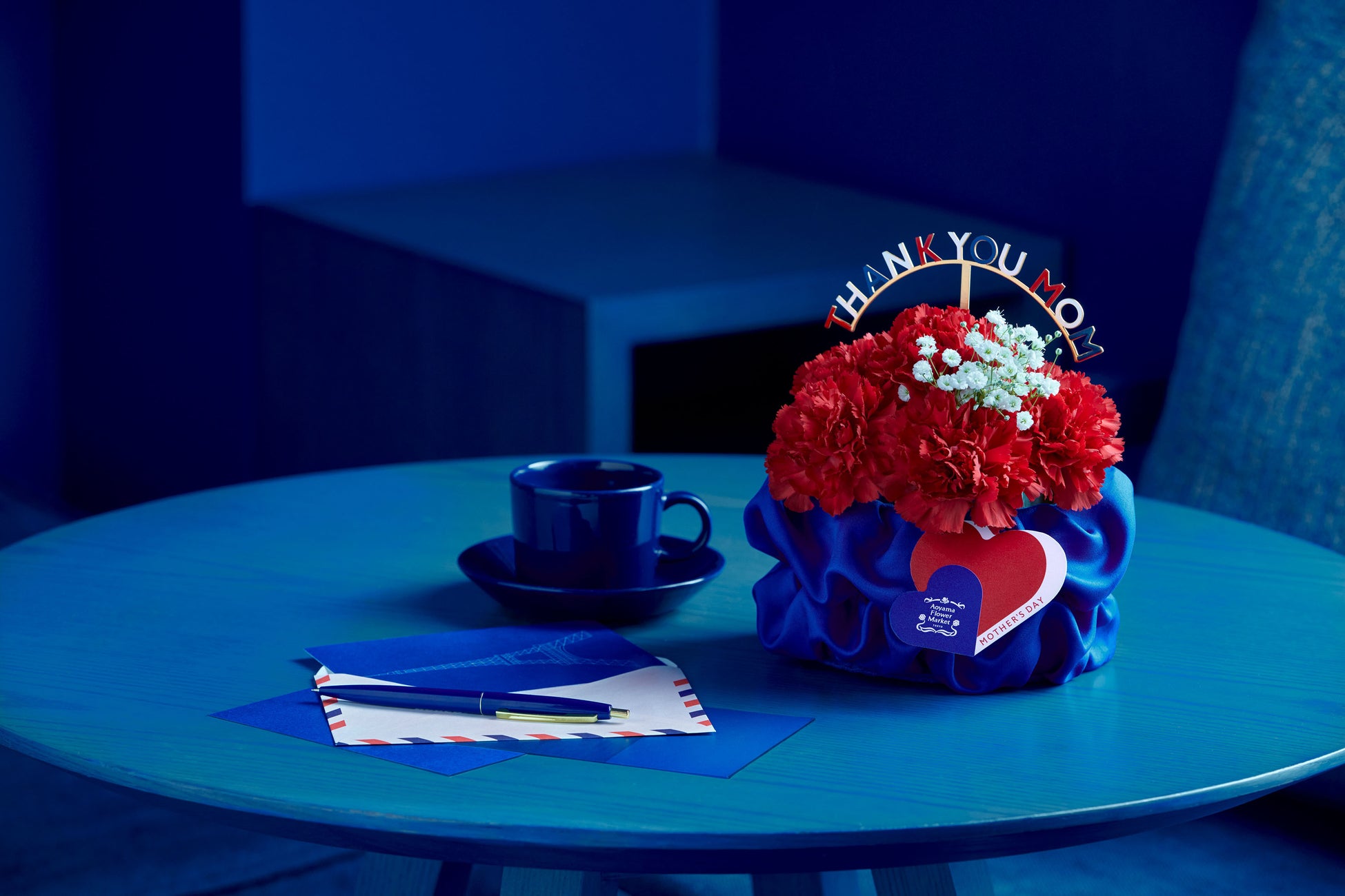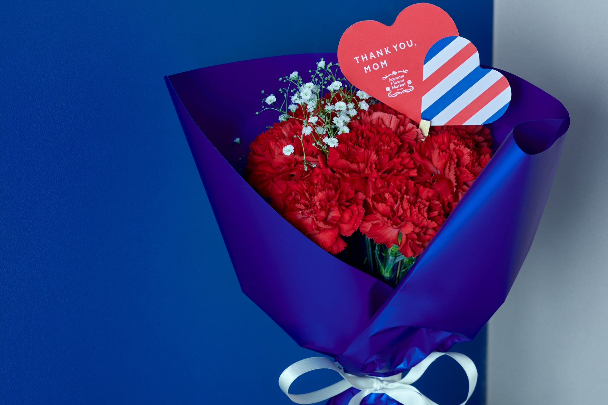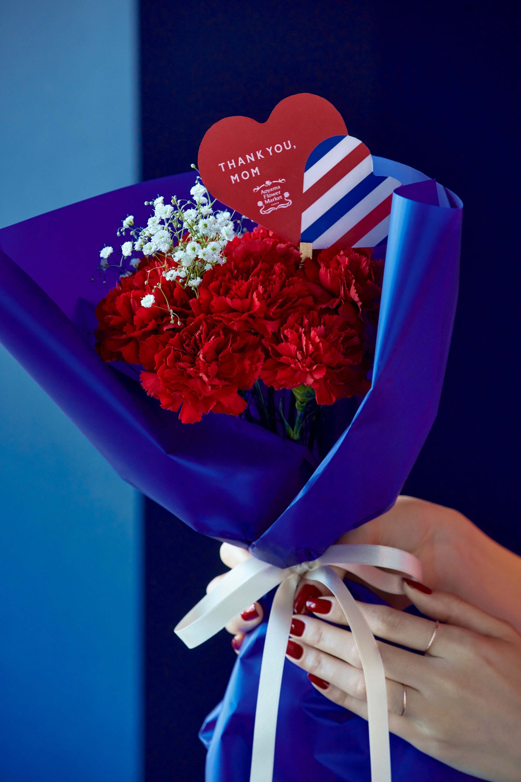 普段口に出せない沢山の感謝の言葉を、ティアラのような“THANK YOU”のメッセージピックに込めて。定番の赤いカーネーションにはブルーの艶やかなサテンをオートクチュールのようにまとわせて、カスミソウをアクセサリーのように添えたらフレンチシックを感じるスタイルが完成。いつまでも自由で、愛にあふれたママでいてほしいというメッセージを、青、白、赤のトリコロールに込めて贈ってみてはいかがでしょうか。