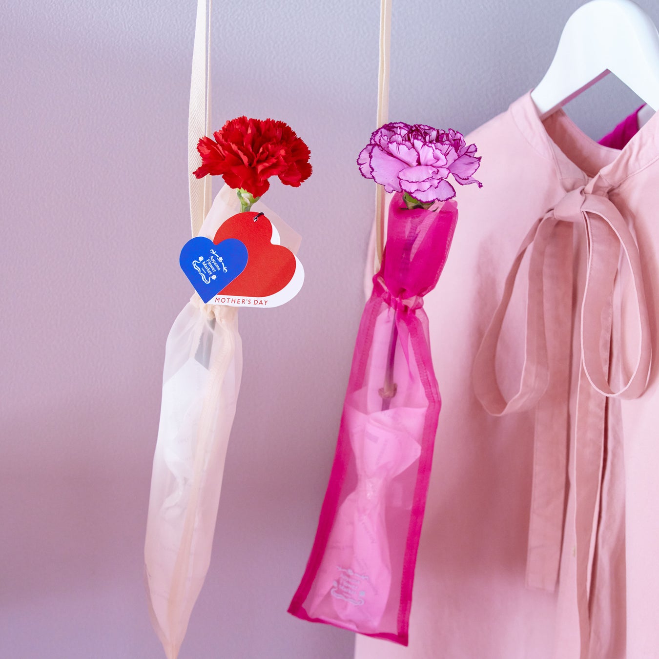 カーネーションにふわっとしたオーガンジーをまとわせて。肩肘張らず、気軽に渡したい方にぴったり。