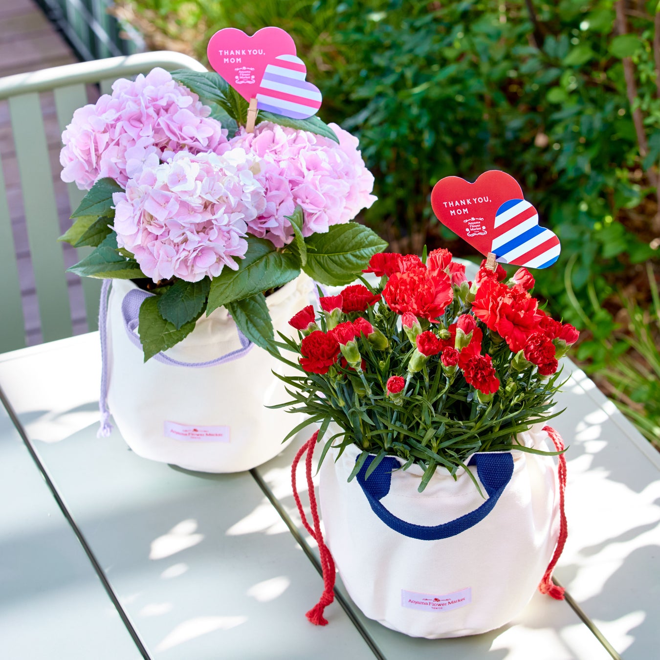 こだわりの産地からセレクトしたフレッシュなアジサイとカーネーションの鉢植えは、トリコロールカラーが印象的なマルシェバッグにイン。育っていく毎日の変化を観察しながら、長く愛でられるのも植物好きにはたまりません。