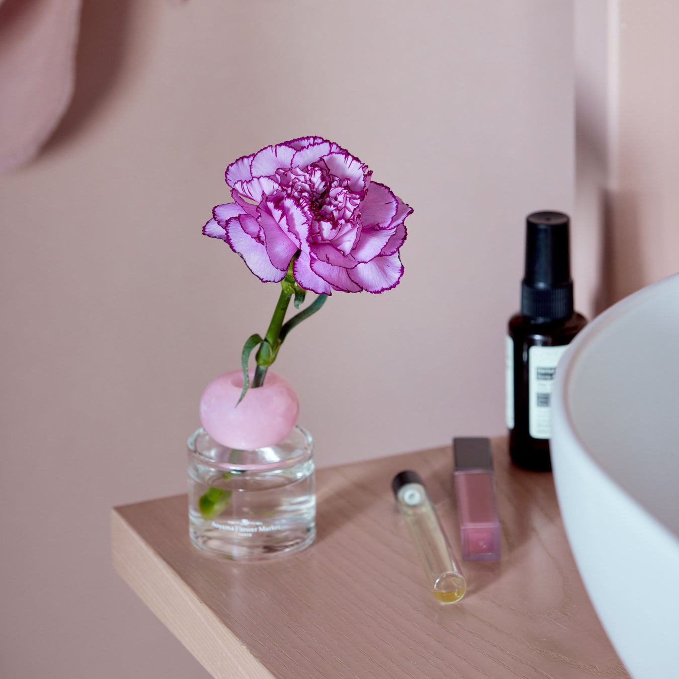 そんなノスタルジックな記憶を呼び覚ます、香水瓶をモチーフにしたフラワーベースには、潔く花を一輪いけて。母の日の後もメイクの時間を彩ってくれそう。