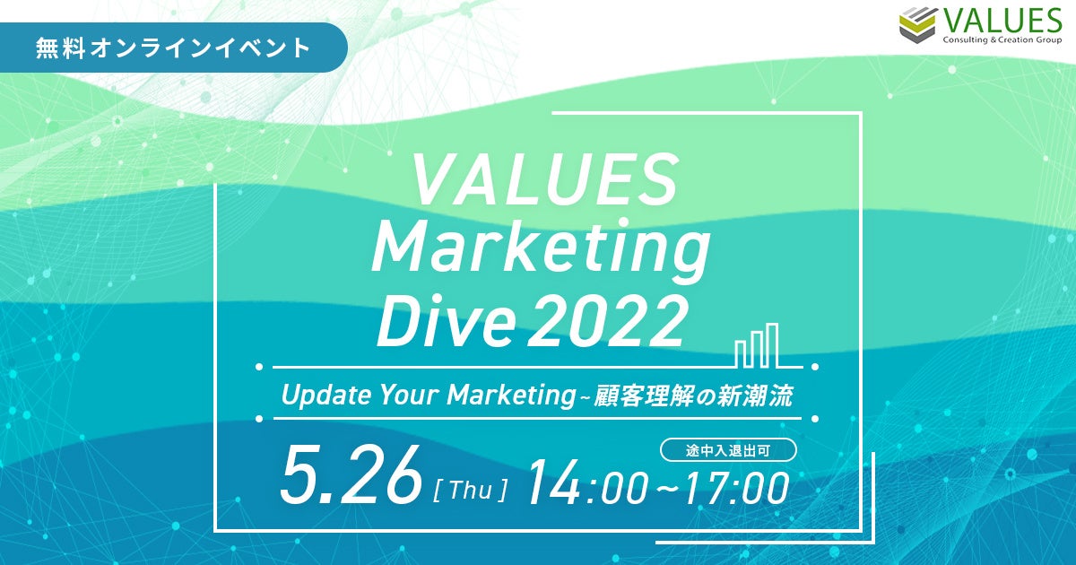 インターネット行動ログ分析によるマーケティング調査・コンサルティングサービスを提供する株式会社ヴァリューズ(本社:東京都港区、代表取締役社長:辻本 秀幸、以下「ヴァリューズ」)は、「Update your marketing ~ 顧客理解の新潮流」をテーマとしてマーケティングやデータ分析の最前線における課題解決のヒントを紹介するカンファレンス『VALUES Marketing Dive 2022』を、2022年5月26日(木)14:00~17:00にオンラインで無料開催いたします。