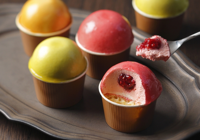 形のカップスイーツです。ベリーシロップを染み込ませたスポンジと、カスタードクリームを交互に重ね、3種類のムースをのせました。