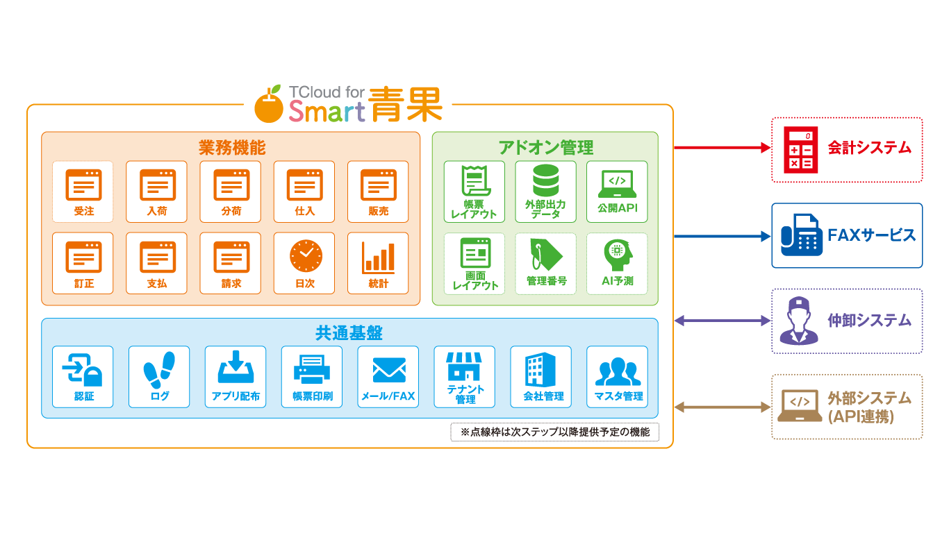 「業界共通のクラウドプラットフォーム」として、環境変化の激しい青果卸売業のICT活用促進に向けたサービスを提供し、持続的な価値向上に寄与します。