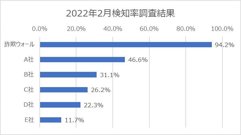 詐欺ウォールを開発・提供するBBソフトサービスでは、公的機関などとの連携により収集した詐欺サイトURLを利用し、定期的に詐欺サイトの検知率調査を行っています。2022年2月の詐欺ウォールによる詐欺サイト検知率は94.2%と他社と比較し高い結果となりました。