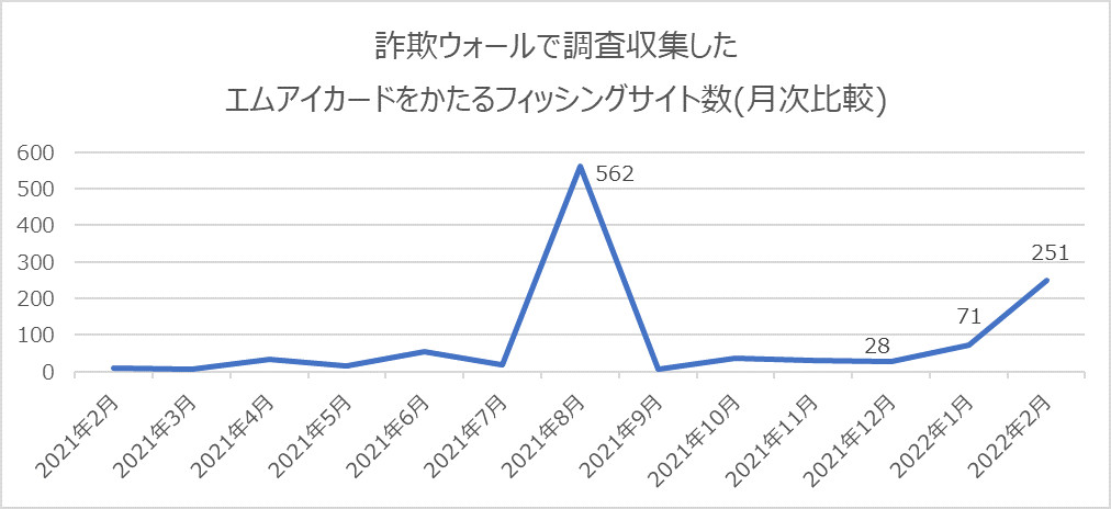 BBソフトサービス株式会社が開発・提供する、ネット詐欺専用セキュリティソフトの詐欺ウォールの調査として収集しているフィッシング詐欺サイトにおいて、2022年2月はエムアイカードをかたるフィッシング詐欺サイトが2021年8月以降最多、前月比約3.5倍の251件となりました。