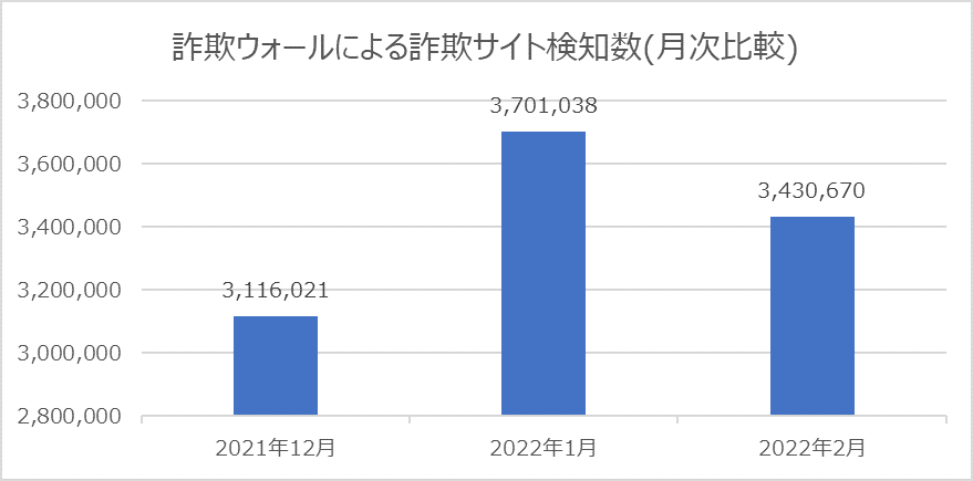 2022年2月に詐欺ウォールによる詐欺サイト検知数は3,430,670件となり、2022年1月と比較すると270,368件減少する結果となりました※。年始にかけて増加する買い物などの需要を狙った詐欺サイトの動きが落ち着いたものと考えられます。