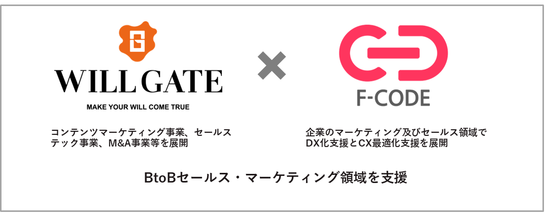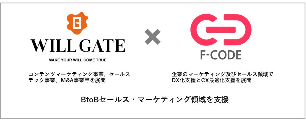 株式会社エフ・コード(本社:東京都新宿区、代表取締役社長:工藤勉、証券コード:9211、以下「当社」)は、株式会社ウィルゲート(本社:東京都港区区、代表取締役:小島梨揮、以下「ウィルゲート」)にBtoBセールス・マーケティング支援サービスを導入したことを発表いたします。