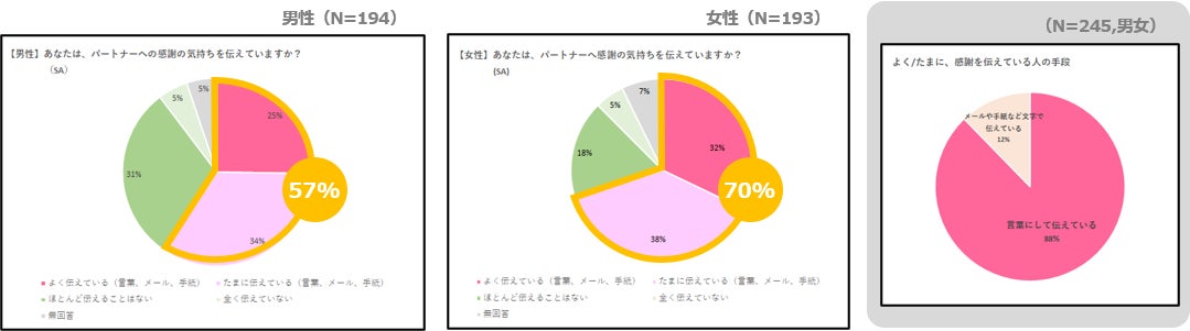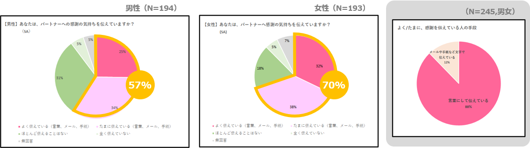 ■習慣的にパートナーへの感謝を伝えているのは、男性57%、女性70%