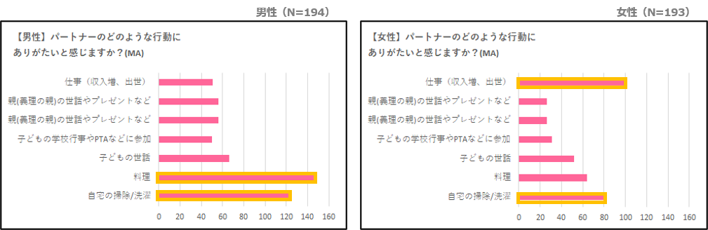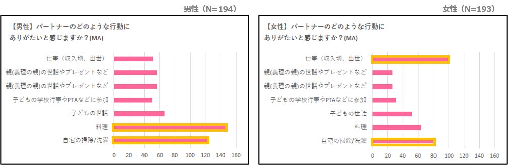 パートナーへの感謝、男性は「家事労働」、女性は「収入増や出世」が最多 ~家事や育児の負担が大きい女性でも、活躍をあきらめない社内制度とは~