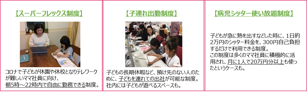 朝の5時から夜の10時までの間、断続的に自分でスケジュールを組んで働ける「スーパーフレックス制度」はコロナ禍で保育園や学校がお休みになるママ社員にはよく活用される制度です。また、なるべく欠勤・有給消化をしなくても済むように、ママ社員たちの救済措置として導入した「土日働いていいよ制度」も好評で、試験的に導入しその後常設制度として採用されました。 (代表 岩崎裕美子)