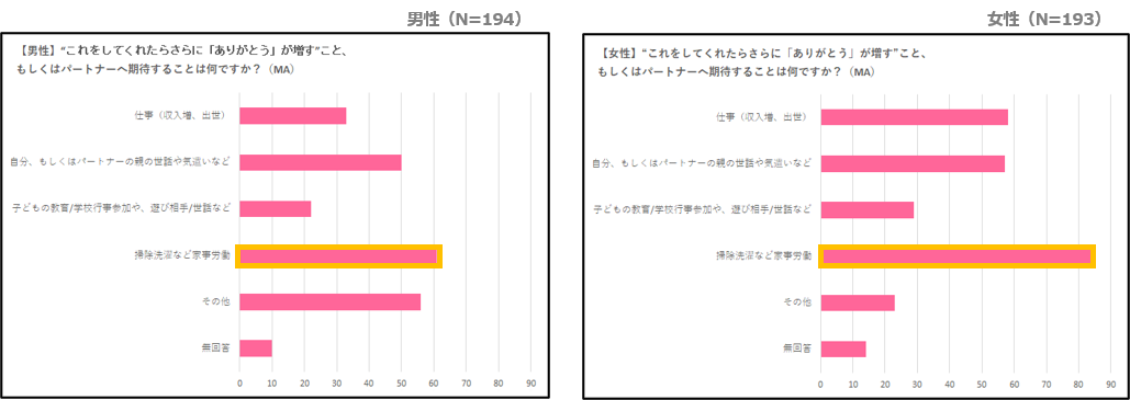 - 感謝の気持ちが増すのは、男女ともに「掃除洗濯など家事労働」が最多