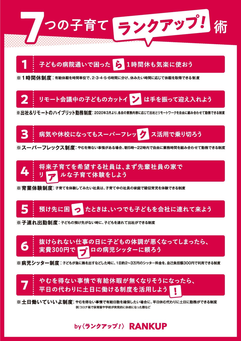 働きながら子育てをする社員が遠慮や萎縮することなく堂々と社内制度を活用して快適に仕事を続けてもらうため、社名“ランクアップ”をもじった、「7つの子育てランクアップ!術」として7つの制度を掲げています。