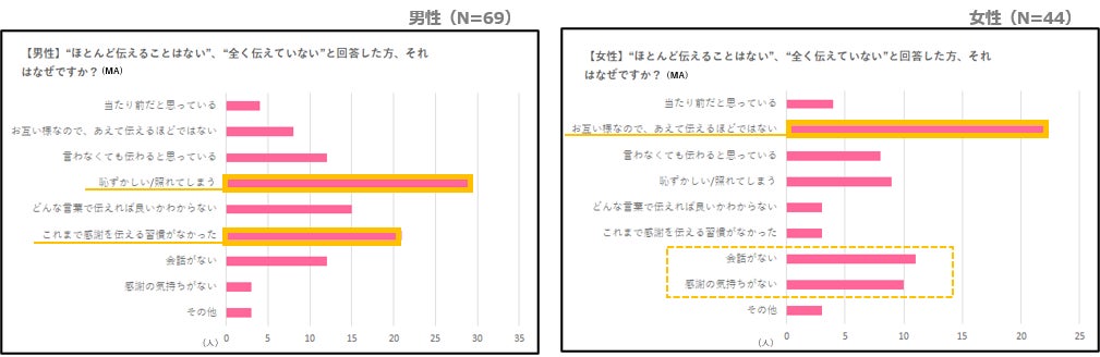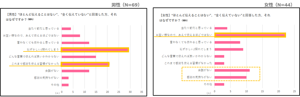 男性では、「恥ずかしい/照れてしまう」という回答が最も多く、「これまで感謝を伝える習慣がなかった」という回答が続きました。女性の最も多い回答は「お互い様なので、あえて伝えるほどではない」となりました。