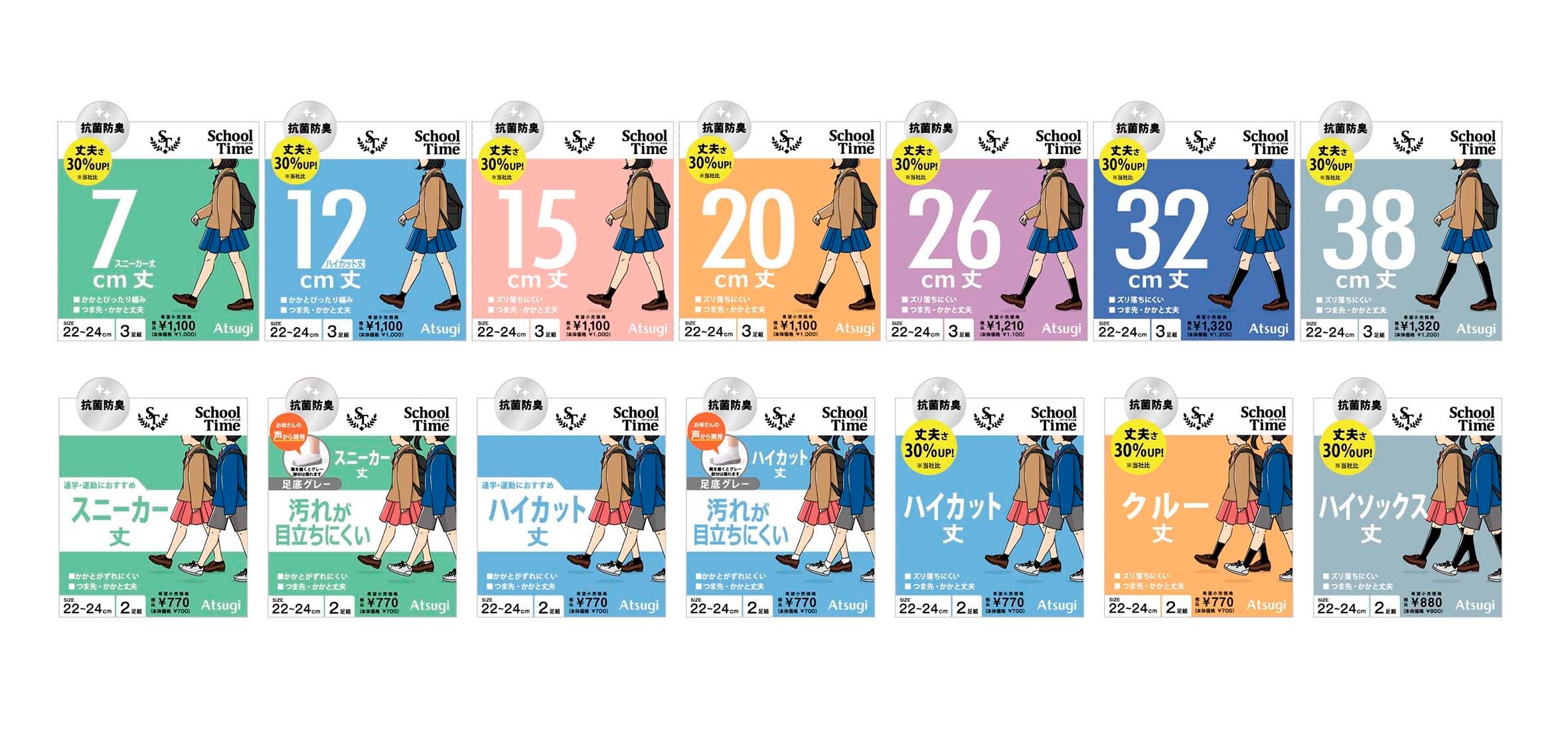アツギのスクールタイムは、女子中高生を想定した婦人と子どもの全14型展開。そのうちリニューアル前からのロングセラーアイテム10型は、ポリエステル混率を高めて丈夫さを30%アップしました(当社従来品比較)。また新商品として足底グレーソックス2型と、スニーカー丈・ハイカット丈の新商品2型を展開し、計14型を提案いたします。