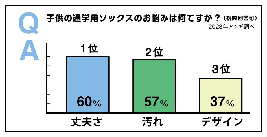 今回アツギが実施した調査によると、子ども用(通学用)ソックスのお悩みの第1位は「丈夫さ」2位が「汚れ」で、3位の「デザイン」を20pt以上引き離しました。そこで今回はこの「2大お悩み」に着目したリニューアルを行いました。