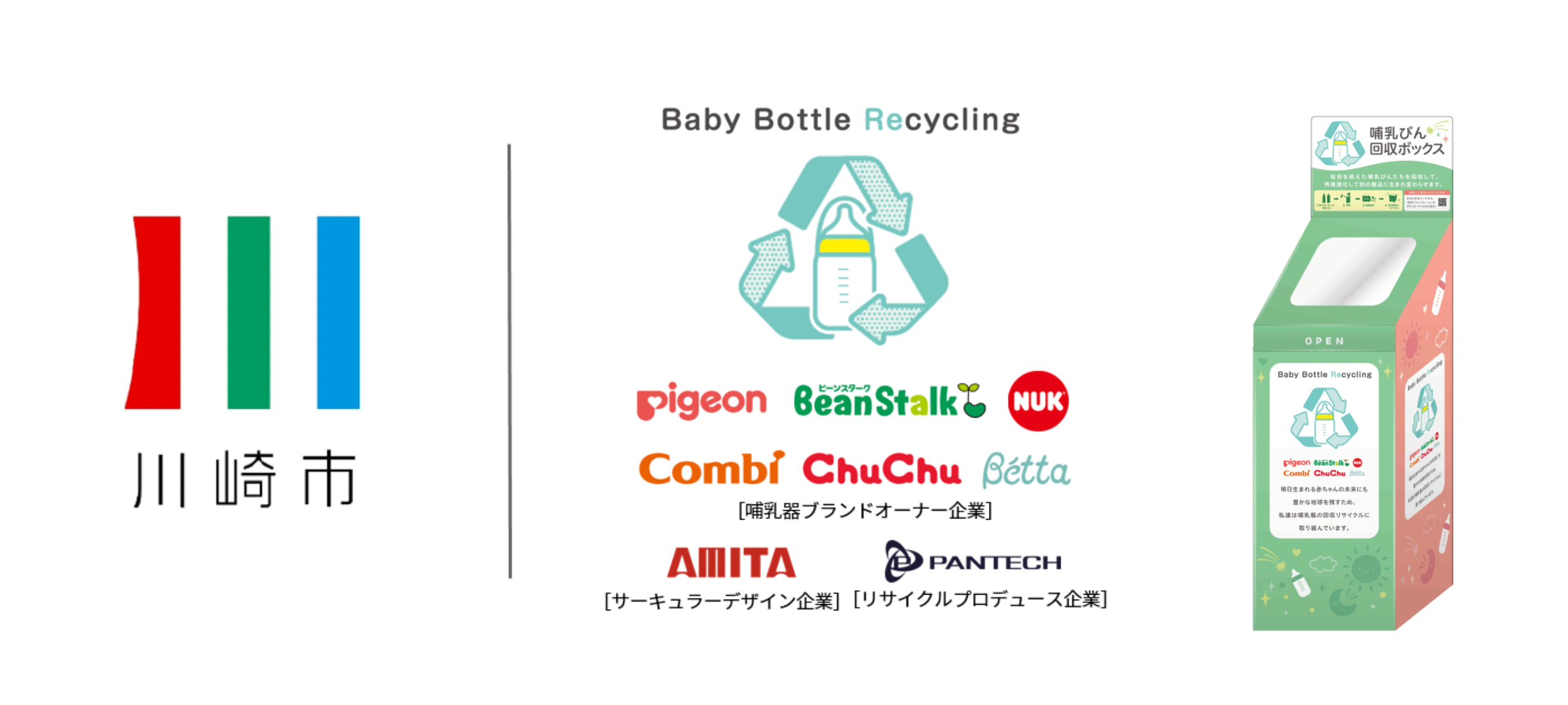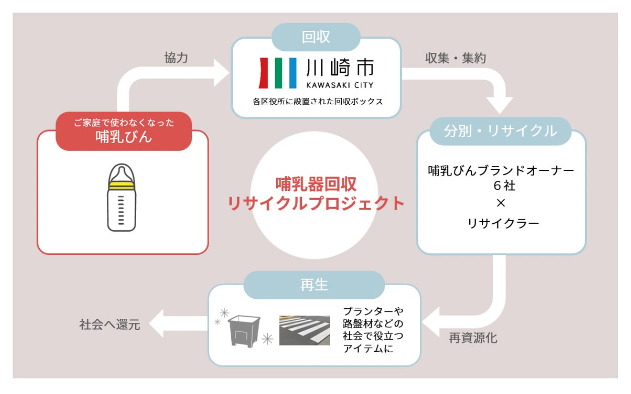 本実証実験は、川崎市が行う「かわさきプラスチック循環プロジェクト」の一環として、哺乳器のブランドオーナー・販売企業6社、川崎市、アドバイザーとしてアミタ株式会社、リサイクラーとして株式会社パンテックが連携した取り組みです。