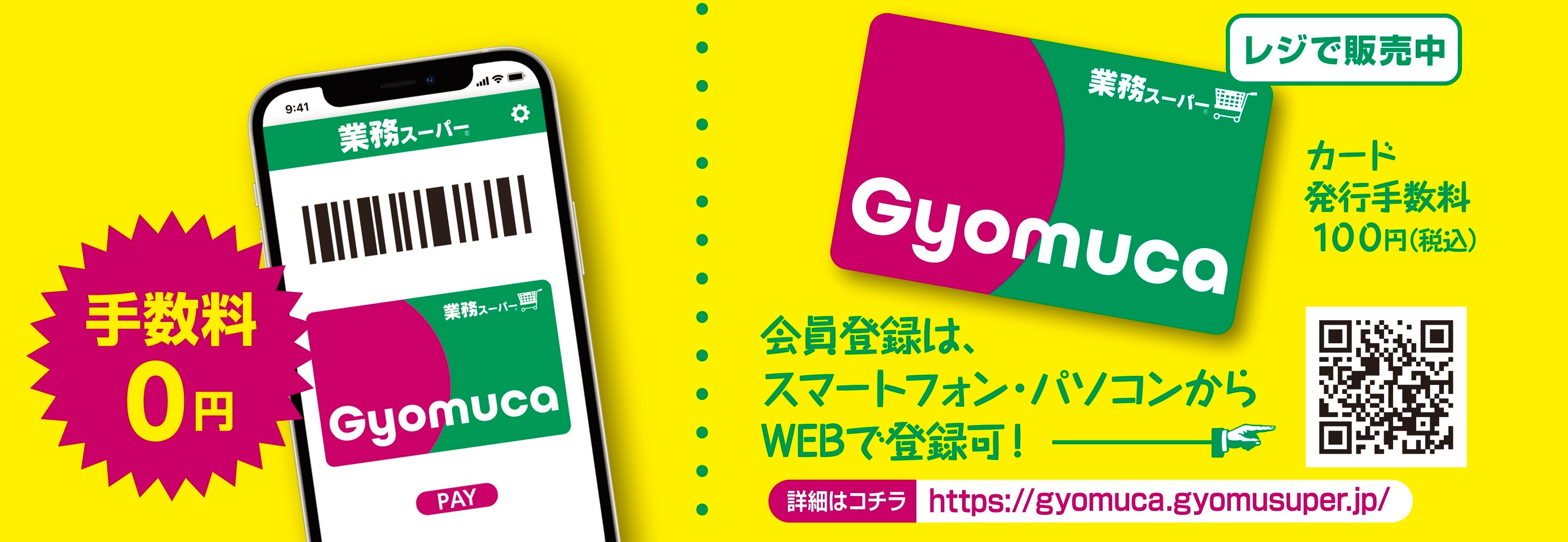 「Gyomuca」は、業務スーパーでのみ利用できる独自の電子マネー機能を搭載した「業務スーパー」公式アプリです。スマートフォンにアプリをインストール後、会員登録し、店頭の入金機から現金をチャージすることで、お支払い時の利用が可能となります。年会費や入会金は無料。チャージ時にチャージ額の0.5%分のポイントを付与します。