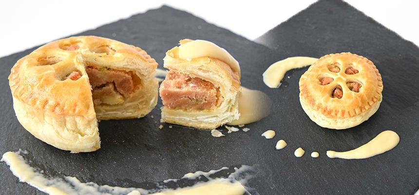 桜の形にくり抜いた見た目がとてもかわいい丸型のパイ。中には鯛と春の野菜である菜の花を使い、贅沢にチェダーチーズとモッツァレラチーズを使ったソースを添えました。サクサクした食感が楽しいパイとソースを絡めてお召し上がりください。(内容量:60g、サイズ:直径約6.5cm、価格:1,100円(税込)、原産国名:日本)
