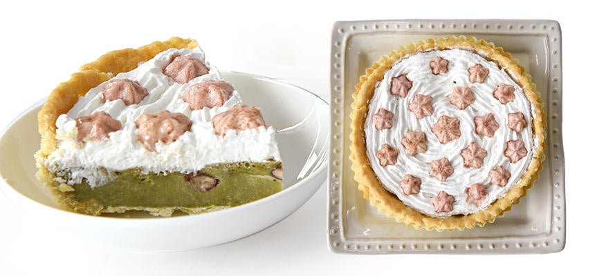 白いクリームの上にピンク色の桜の花のクッキーを散りばめた春色の和風タルト。春の新緑をイメージさせる緑色の生地には小豆を入れて仕上げました。かわいい断面もお楽しみください。(内容量:240g、サイズ:直径約12cm×高さ3cm、価格:1,760円(税込)、原産国名:日本)
