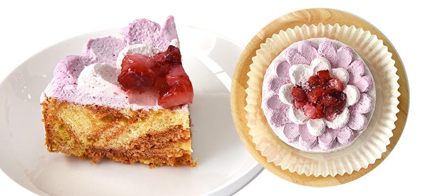 春らしい彩り鮮やかなお花をイメージしたホールケーキ。紫がかった2種類のピンク色のクリームを花びらに見立てました。中のスポンジはピンク色のマーブル模様に可愛く仕上げました。(内容量:140g、サイズ:直径約9cm×高さ3cm、価格:1,760円(税込)、原産国名:日本)