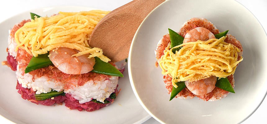 チキンやエビ、卵を使った豪華な見た目が食欲をそそる桜の押し寿司。ピンク色と白色の二層に分けたご飯の間には鶏肉のそぼろと、菜の花のおひたしを入れて仕上げました。(内容量:80g、サイズ:直径約7cm、価格:880円(税込)、原産国名:日本)