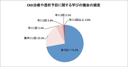そこで、ケアマネジャーに「CKD治療や透析予防に関する学びの機会」の頻度を尋ねたところ、4人に3人(72.2%)が「全くない」と回答しました。年に1回以上学びの機会があるという方は全体の1割未満でした。