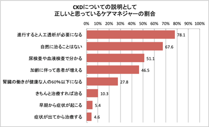 ケアマネジャーの、CKDの知識に関する質問の回答によると、「腎臓の働きが健康な人の60%以下になる(27.8%)」「加齢に伴って患者が増える(46.5%)」「尿検査や血液検査で分かる(51.1%)」といった、CKDを見つけるために必要な知識の項目で正答率が比較的低いことが分かりました。
