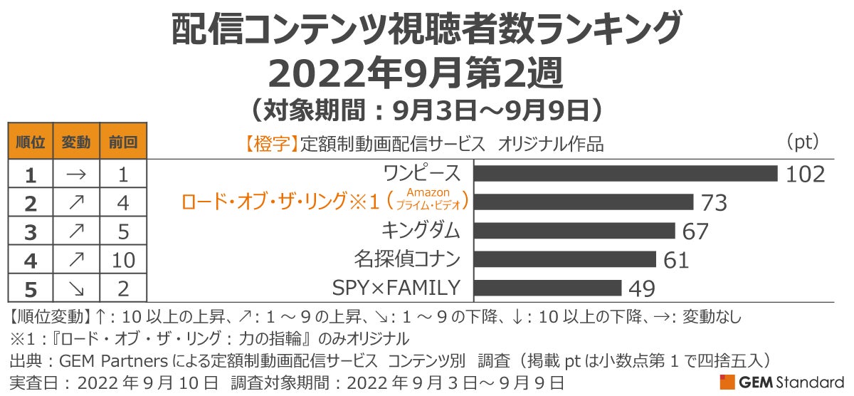 Amazonオリジナル『力の指輪』がけん引し『ロード・オブ・ザ・リング』シリーズ2位に浮上、『ワンピース』配信も強勢で5週連続首位~配信コンテンツ視聴者数ランキング(9月第2週)