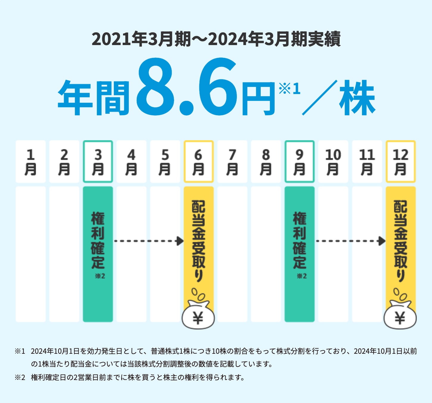 ソフトバンクは、個⼈株主のより⼀層の拡⼤を⽬指し、2024年10⽉1⽇に1株を10分割する株式分割を⾏いました。また、ソフトバンクの普通株式を1年以上かつ100株以上保有すると、PayPayマネーライト1,000円分を進呈する株主優待制度の新設を発表しました。そして、このたび3月31日※1に加えて9月30日※1を株主優待の基準日に設定します※2。
