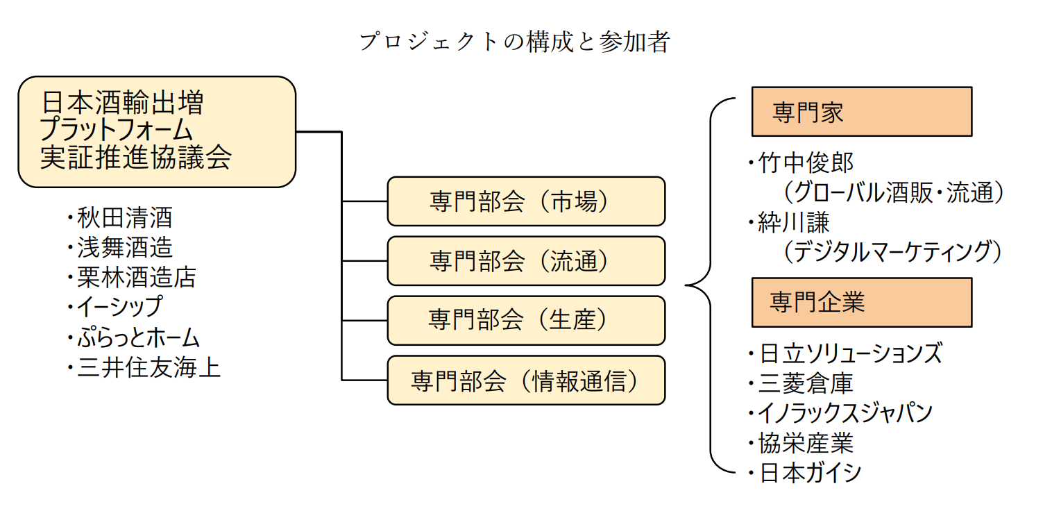プロジェクトには専門部会が設置され、グローバルな酒類・飲食品流通、デジタルマーケティングに関する知見を有する専門家、食品流通、運送事業、情報通信技術、素材技術分野等の各分野で先端の知識やソリューションを有する専門企業が参加し、各領域の知見や先端技術を動員し、実際に日本酒の海外輸出を実施しながら、新世代の新しい日本酒輸出物流モデルの構築と実証を行います。