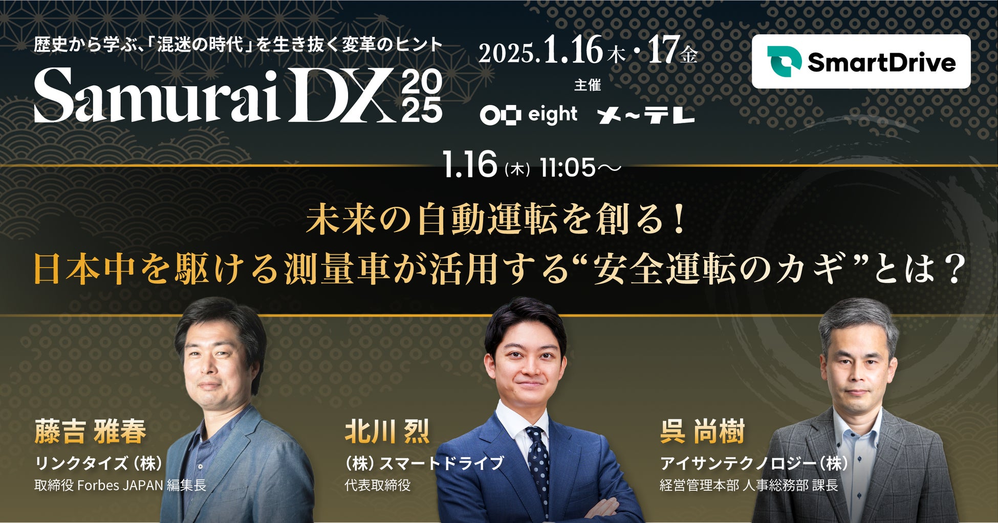 モビリティデータを活用したサービスを提供する株式会社スマートドライブ(本社所在地:東京都千代田区、代表取締役:北川 烈、以下「当社」)は、2025年1月16日(木)・17日(金)にSansan株式会社が提供する名刺アプリ「Eight」と名古屋テレビ放送株式会社(以下、メ~テレ)が主催するビジネスカンファレンス「SamuraiDX 2025」に、当社代表取締役 北川・営業本部長 黒澤が登壇しますのでお知らせします。