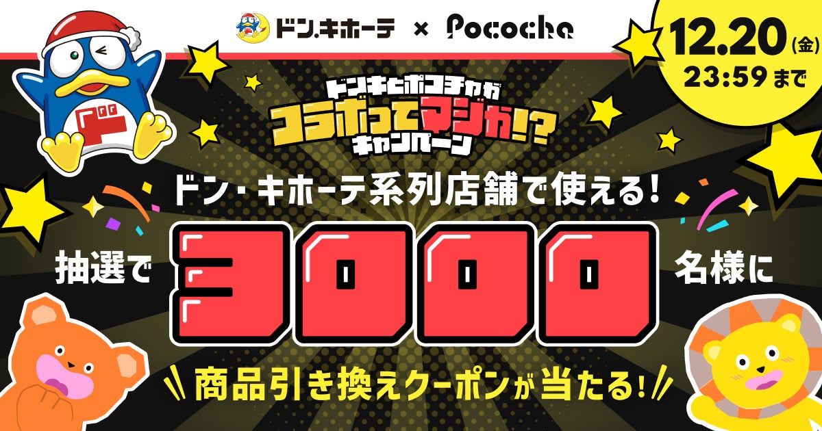 株式会社ディー・エヌ・エー(本社:東京都渋谷区、代表取締役社長兼CEO:岡村 信悟、以下DeNA)が運営する、ライブコミュニケーションアプリ「Pococha(ポコチャ)」は、株式会社パン・パシフィック・インターナショナルホールディングス(本社:東京都、代表取締役社長CEO:吉田 直樹)が展開する、総合ディスカウントストア「ドン・キホーテ」と初のコラボレーションキャンペーンとなる「ドンキとポコチャがコラボってマジか!?キャンペーン」を2024年12月10日(火)〜12月20日(金)の期間で開催します。