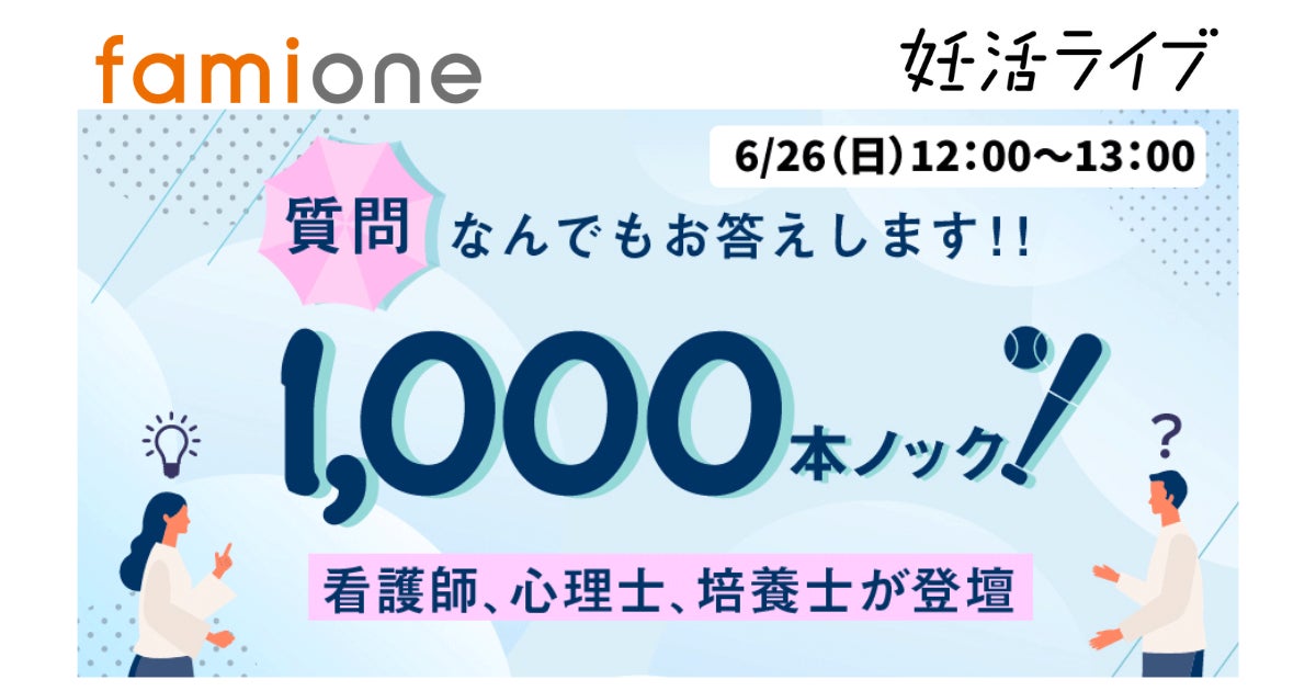 「子どもを願うすべての人によりそい 幸せな人生を歩める社会をつくる」をビジョンに掲げ、LINEを活用した妊活コンシェルジュサービス「famione(ファミワン)」 https://lp.famione.com/ を提供する株式会社ファミワン(本社:東京都渋谷区、代表取締役:石川勇介)は、「妊活ライブ」上にて、6月26日(日)に妊活ライブの人気企画「質問1000本ノック!」と題したオンラインセミナー(https://famione.com/live/before/220626/)を実施します。「妊活ライブ」会員サービスでは、月額500円で毎月セミナーの参加と100本以上のアーカイブ動画の視聴がご利用いただけます。
