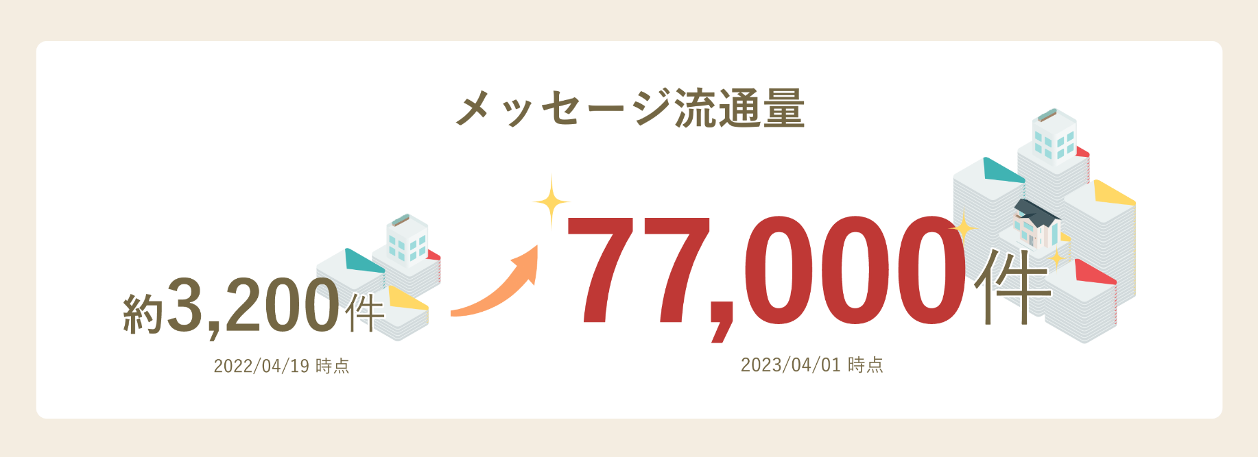 機能リリースなどもあり、プロダクト内での月間メッセージ数は1年前と比較し、24倍の約77,000件に増えております。