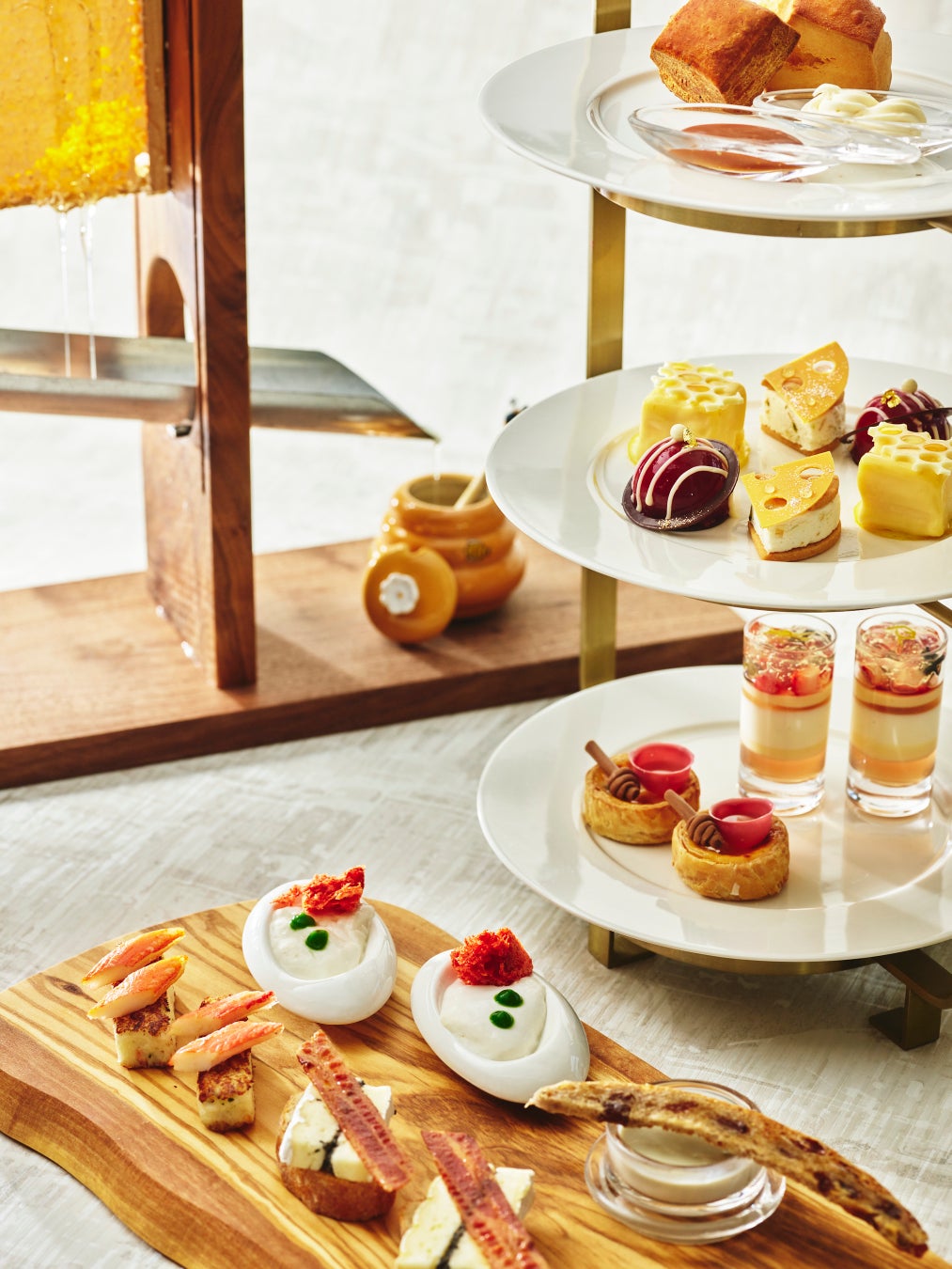 ストリングスホテル東京インターコンチネンタル、ザ・スコア・ダイニングよりイタリアングリル「メロディア」とカフェ&バー「リュトモス」にて提供するストリングス・アフタヌーンティーは、季節ごとにテーマを変え、いつも驚きと新しさを感じることのできる、エグゼクティブペストリーシェフ長田 学とイタリアングリル「メロディア」シェフ山本 健太郎によるコラボレーションアフタヌーンティーです。初夏には、はちみつとチーズをすべてのスイーツ、セイボリー、スコーンにいたるまで堪能できる、贅沢なアフタヌーンティーをご用意しました。食材への敬意と感謝を込めて一品一品を丁寧に作り上げた、アフタヌーンティーとともに、甘美で濃厚なティータイムをお過ごしください。